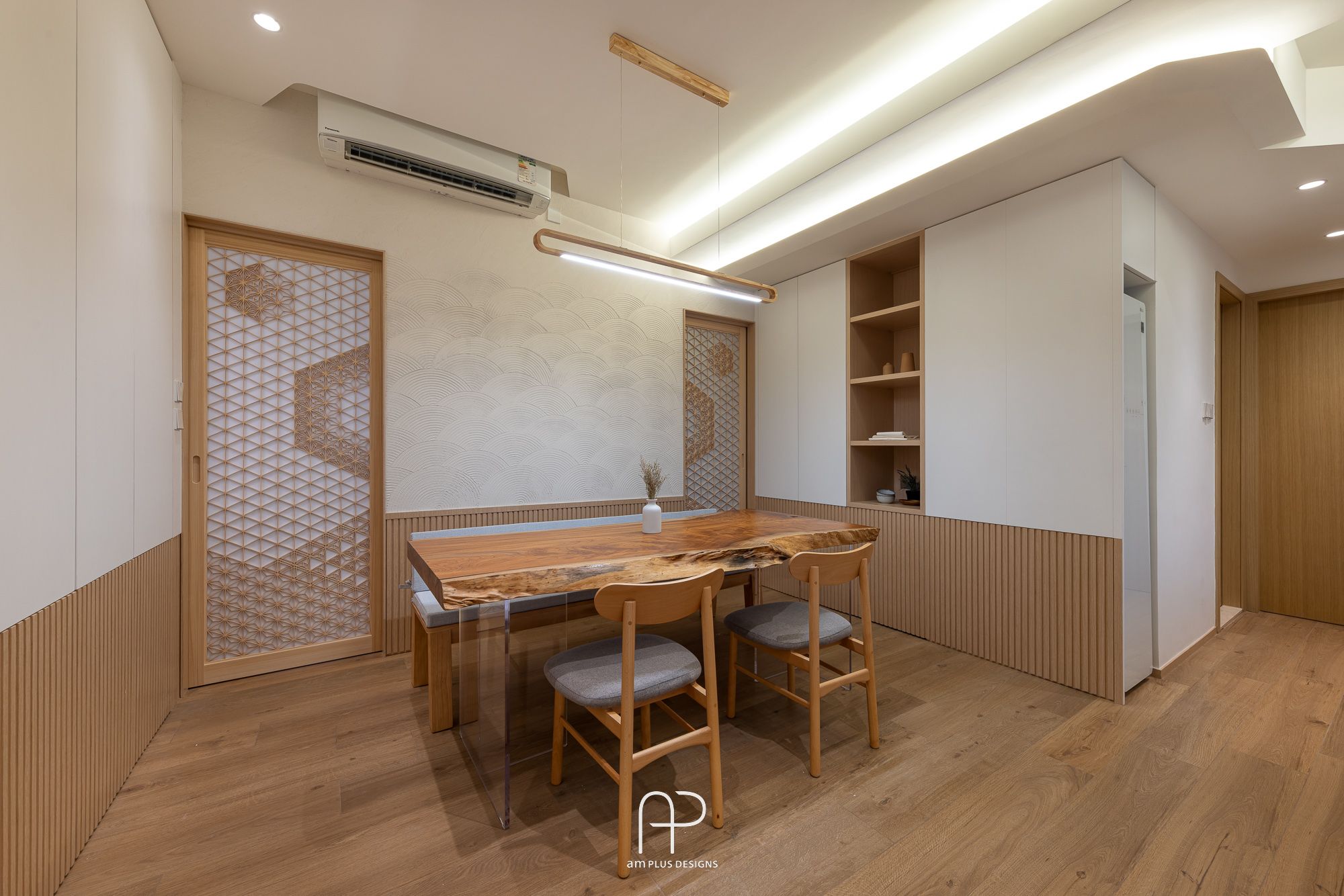 這次 am Plus 全屋空間掌握了日式設計核心,單位使用眾多傳統日式、自然、木質元素,並在造型、燈光、物料搭配上加入不同巧思,以有別以往的新式簡約日系風格,打造舒適居家空間。